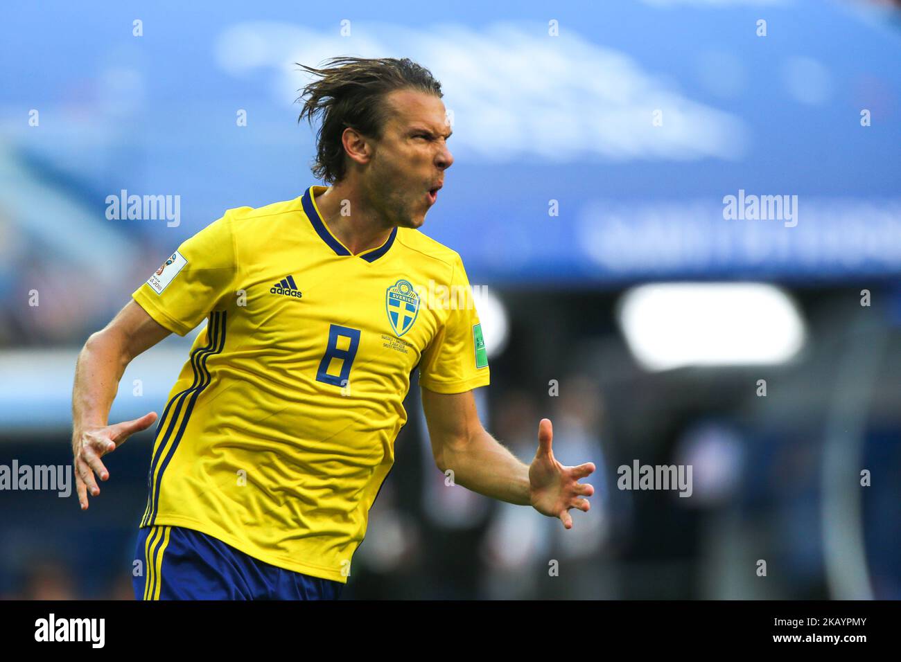 Albin Ekdal Della Nazionale Svedese Reagisce Durante La Partita Di Coppa Del Mondo Fifa 2018 Round Of 16 Tra Svezia E Svizzera Allo Stadio Di San Pietroburgo Il 03 Luglio 2018 A